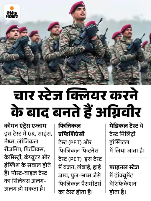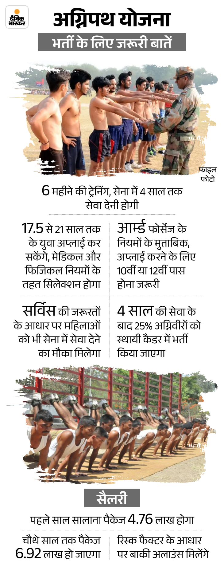 सरकार ने 2022 में अग्निपथ स्कीम लॉन्च की थी। इसके तहत आर्मी, नेवी और एयर फोर्स में चार साल के लिए नौजवानों को कॉन्ट्रैक्ट पर भर्ती किया जाता है। 4 साल में छह महीने की ट्रेनिंग भी शामिल है। चार साल बाद अग्निवीरों को उनकी कार्यक्षमता के आधार पर रेटिंग दी जाएगी। इसी मेरिट के आधार पर 25% अग्निवीरों को परमानेंट सर्विस में लिया जाएगा। बाकी लोग वापस सिविल दुनिया में आ जाएंगे।