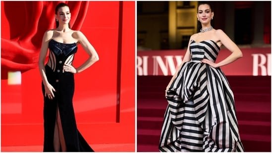 For the exclusive “A Night with Runway” photocall, Anne Hathaway chose a custom Louis Vuitton creation – a strapless gown featuring a sculpted sweetheart neckline and a fitted bodice wrapped in bold black-and-silver contouring the torso.