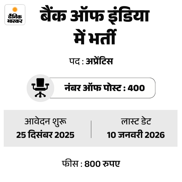 बैंक ऑफ इंडिया ने हाल ही में नई भर्ती का नोटिफिकेशन जारी किया है। जिसमें फ्रेशर्स भी अप्लाई कर सकते हैं। 25 दिसंबर 2025 से फॉर्म भरने की शुरुआत हो रही है। उम्मीदवार ऑफिशियल वेबसाइट bankofindia.bank.in के माध्यम से ऑनलाइन आवेदन कर सकते हैं। आवेदन से पहले उम्मीदवारों का NATS पोर्टल पर रजिस्ट्रेशन होना चाहिए।