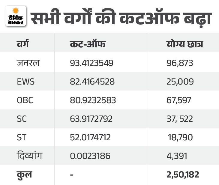 आर्थिक रूप से कमजोर वर्ग (EWS) में 82.41 पर्सेंटाइल पर 25,009, ओबीसी वर्ग में 80.92 पर्सेंटाइल पर 67,597 अभ्यर्थियों ने क्वालिफाई किया है। SC कैटेगरी के लिए 63.91 पर्सेंटाइल पर 37,522 और ST कैटेगरी के लिए 52.01 पर्सेंटाइल पर 18,790 अभ्यर्थी सफल हुए हैं।