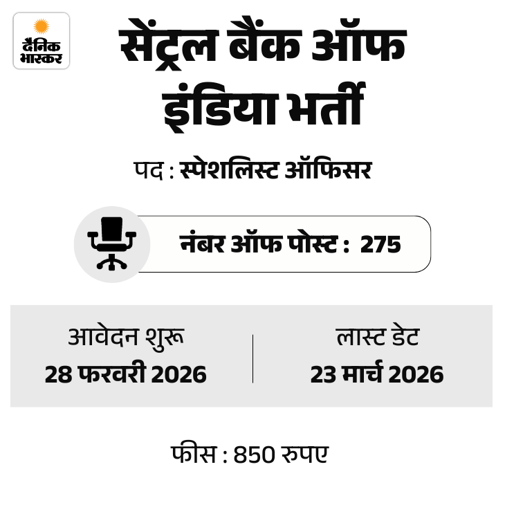 सेंट्रल बैंक ऑफ इंडिया (CBI) ने स्पेशलिस्ट ऑफिसर के 275 पदों पर भर्ती निकाली है। उम्मीदवार सेंट्रल बैंक की ऑफिशियल वेबसाइट centralbankofindia.co.in पर जाकर आवेदन कर सकते हैं।
