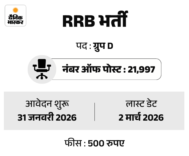 रेलवे भर्ती बोर्ड (RRB) ने 21,997 पदों पर ग्रुप डी के लिए भर्ती निकाली है। इस भर्ती के लिए आवेदन की आखिरी तारीख 2 मार्च 2026 है। उम्मीदवार ऑफिशियल वेबसाइट rrbapply.gov.in पर जाकर अप्लाई कर सकते हैं।