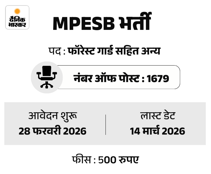 मध्य प्रदेश कर्मचारी चयन मंडल (MPESB) की ओर से वन विभाग के अंतर्गत 1679 पदों पर भर्ती निकली है। उम्मीदवार ऑफिशियल वेबसाइट esb.mp.gov.in पर जाकर आवेदन कर सकते हैं।