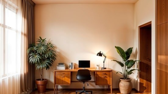- Align the workspace to receive diffused daylight, and layer it with shading elements so the room remains usable through the day.