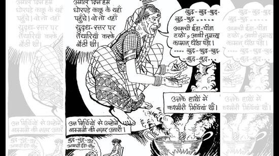 Comics, perhaps more than most art forms, reflect oral storytelling traditions. Chudail, in addition, features anecdotes that Khodke’s mother, Kiran, passed down to him. His comic also unfolds like a spoken story. It’s casual and conversational while carrying within it a sharp social and political commentary.