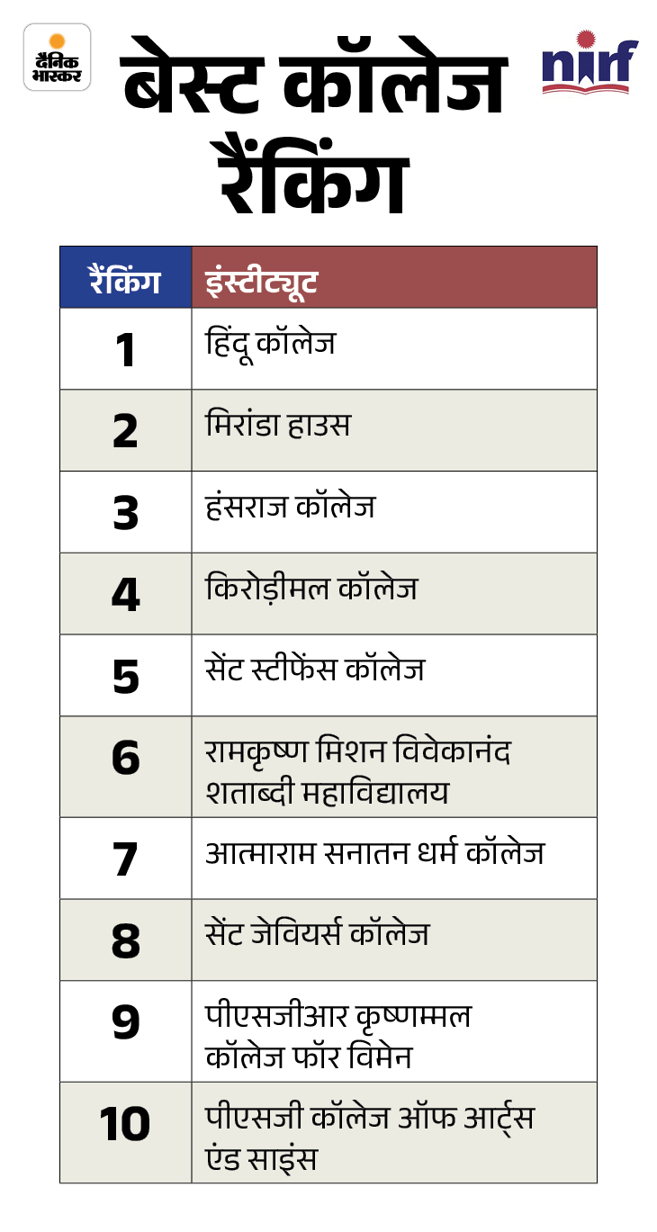 शिक्षा मंत्रालय ने 4 सितंबर को नेशनल इंस्टीट्यूशनल रैंकिंग फ्रेमवर्क (NIRF) 2025 जारी कर दी हैं। कुल 17 कैटेगरीज में भारत के बेस्ट शिक्षा संस्थानों की लिस्ट जारी की गई है। इंजीनियरिंग कैटेगरी में IIT मद्रास बेस्ट संस्थान बना है। वहीं कॉलेज कैटेगरी में DU का हिंदू कॉलेज टॉप पर है। ओवरऑल कैटेगरी में IIT मद्रास बेस्ट इंस्टीट्यूट बना है।