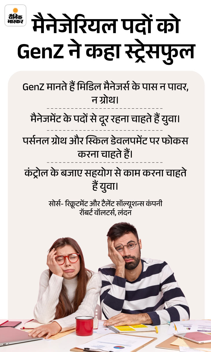 52% GenZ प्रोफेशनल्स ने कहा कि वो मिडिल मैनेजर्स नहीं बनना चाहते हैं। वहीं 69% ने माना कि उन पदों में फायदा बहुत कम और स्ट्रेस बहुत ज्यादा है। लंदन की ग्लोबल रिक्रूटमेंट और टैलेंट सॉल्यूशन्स कंपनी रॉबर्ट वॉलटर्स के सर्वे से ये जानकारी मिली है।