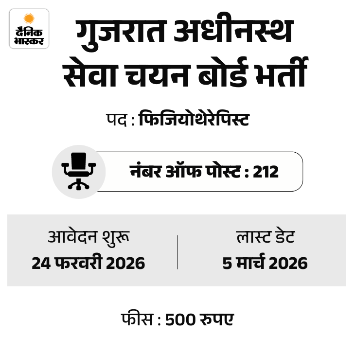 गुजरात अधीनस्थ सेवा चयन बोर्ड ने फिजियोथेरेपिस्ट के 212 पदों पर भर्ती निकाली है। उम्मीदवार ऑफिशियल वेबसाइट पर जाकर आवेदन कर सकते हैं। फीस जमा करने की आखिरी तारीख 8 मार्च 2026 तय की गई है।