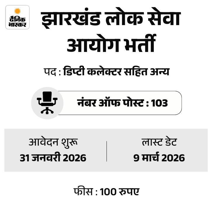 झारखंड लोक सेवा आयोग यानी JPSC ने संयुक्त असैनिक सेवा प्रारंभिक प्रतियोगिता परीक्षा 2025 के लिए आवेदन की तारीख बढ़ा दी है। उम्मीदवार अब 9 मार्च 2026 तक आवेदन कर सकते हैं। इस भर्ती के तहत 103 पद भरे जाएंगे।