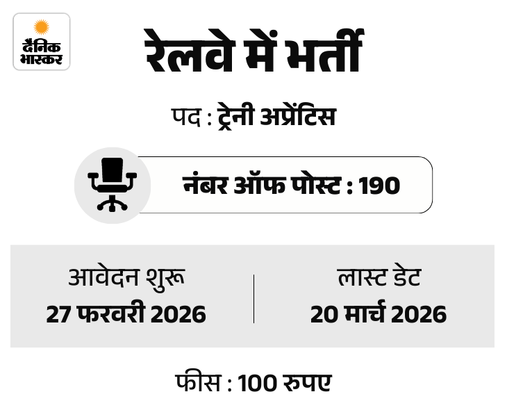 आज की सरकारी नौकरी में जानकारी रेलवे में 190 पदों पर निकली भर्ती की। गुजरात में फिजियोथेरेपिस्ट के 212 पदों पर भर्ती। साथ ही झारखंड सिविल सर्विस एग्जाम के लिए आवेदन की तारीख 9 मार्च 2026 तक बढ़ने की।
