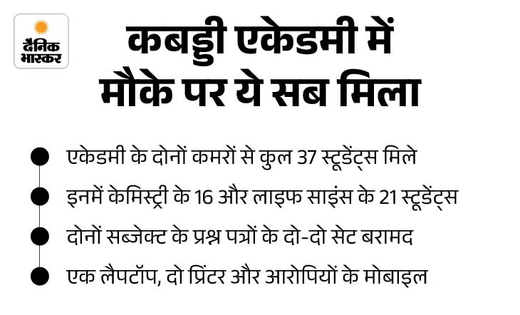 जिस टैम्पो ट्रैवलर में स्टूडेंट्स को गोहाना एकेडमी तक लाया गया, उसका पीछा करते हुए फ्लाइंग टीम भी पहुंच गई। मौके पर 37 अभ्यर्थी मौजूद मिले। इनमें से 16 को कैमिस्ट्री तो 21 स्टूडेंट्स लाइफ साइंस विषय का पेपर देना था। मौके से दोनों विषयों के A व B सेट के प्रश्न पत्र मिले, जिनके कुल 66 पेज हैं।