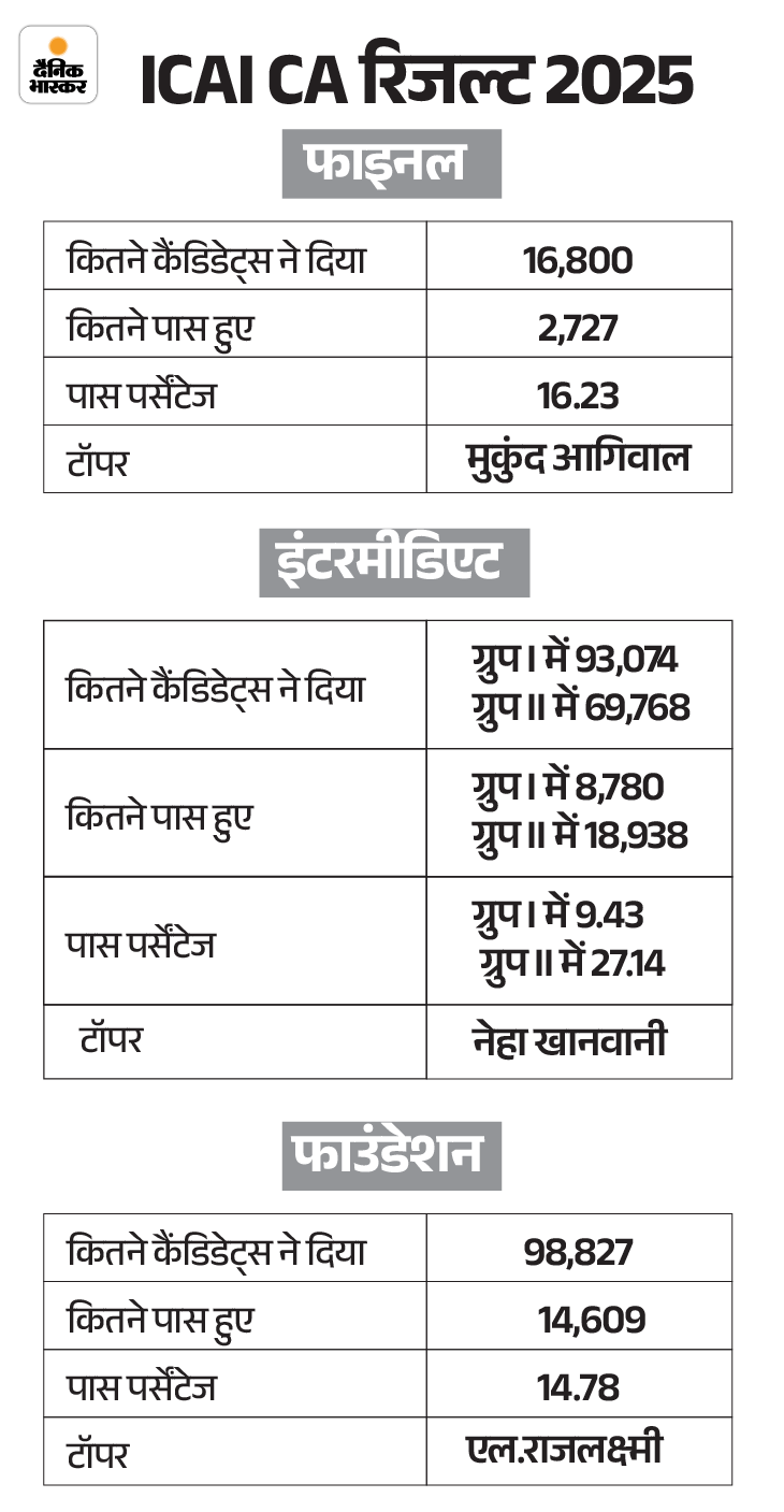 इंटरमीडिएट परीक्षा के ग्रुप-I में 93,074 कैंडिडेट्स शामिल हुए, जिनमें से 8,780 पास हुए। वहीं ग्रुप-II में 69,768 उम्मीदवारों में से 18,938 ने सफलता हासिल की। इस परीक्षा में नेहा खानवानी, कृति शर्मा और अक्षत बिरेंद्र नौटियाल को टॉप तीन पोजीशन मिलीं।