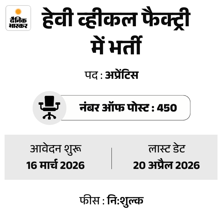 3. हेवी व्हीकल फैक्ट्री में 450 भर्ती, बिना एग्जाम, इंटरव्यू के सिलेक्शन