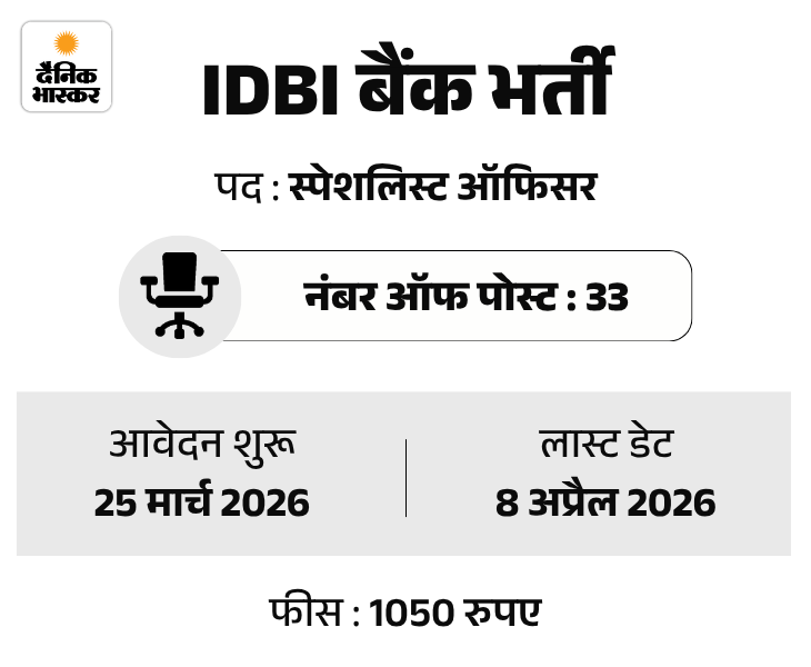 आईडीबीआई बैंक ने स्पेशलिस्ट ऑफिसर के 33 पदों पर भर्ती निकाली है। उम्मीदवार बैंक की ऑफिशियल वेबसाइट idbibank.in पर जाकर आवेदन कर सकते हैं।