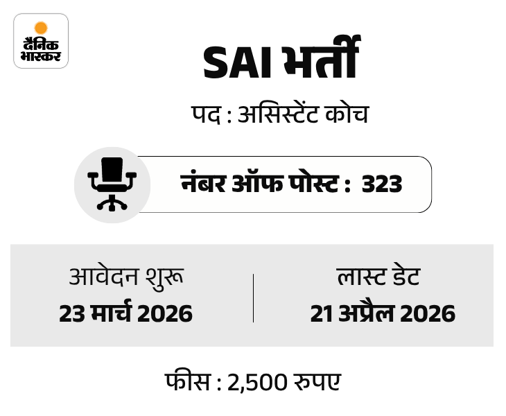 स्पोर्ट्स अथॉरिटी ऑफ इंडिया (SAI) में कोच के 323 पदों पर भर्ती निकली है। उम्मीदवार SAI की ऑफिशियल वेबसाइट sportsauthorityofindia.gov.in पर जाकर आवेदन कर सकते हैं।