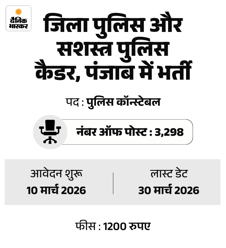 जिला पुलिस और सशस्त्र पुलिस कैडर में कॉन्स्टेबल के पदों पर भर्ती निकली है। इस भर्ती के लिए आवेदन की आखिरी तारीख 30 मार्च तय की गई है। उम्मीदवार ऑफिशियल वेबसाइट punjabpolice.gov.in पर जाकर आवेदन कर सकते हैं। इस भर्ती के लिए पुलिस द्वारा स्थापित कंट्रोल रूम से संपर्क करने के लिए 02261306246 नंबर जारी किया गया है।