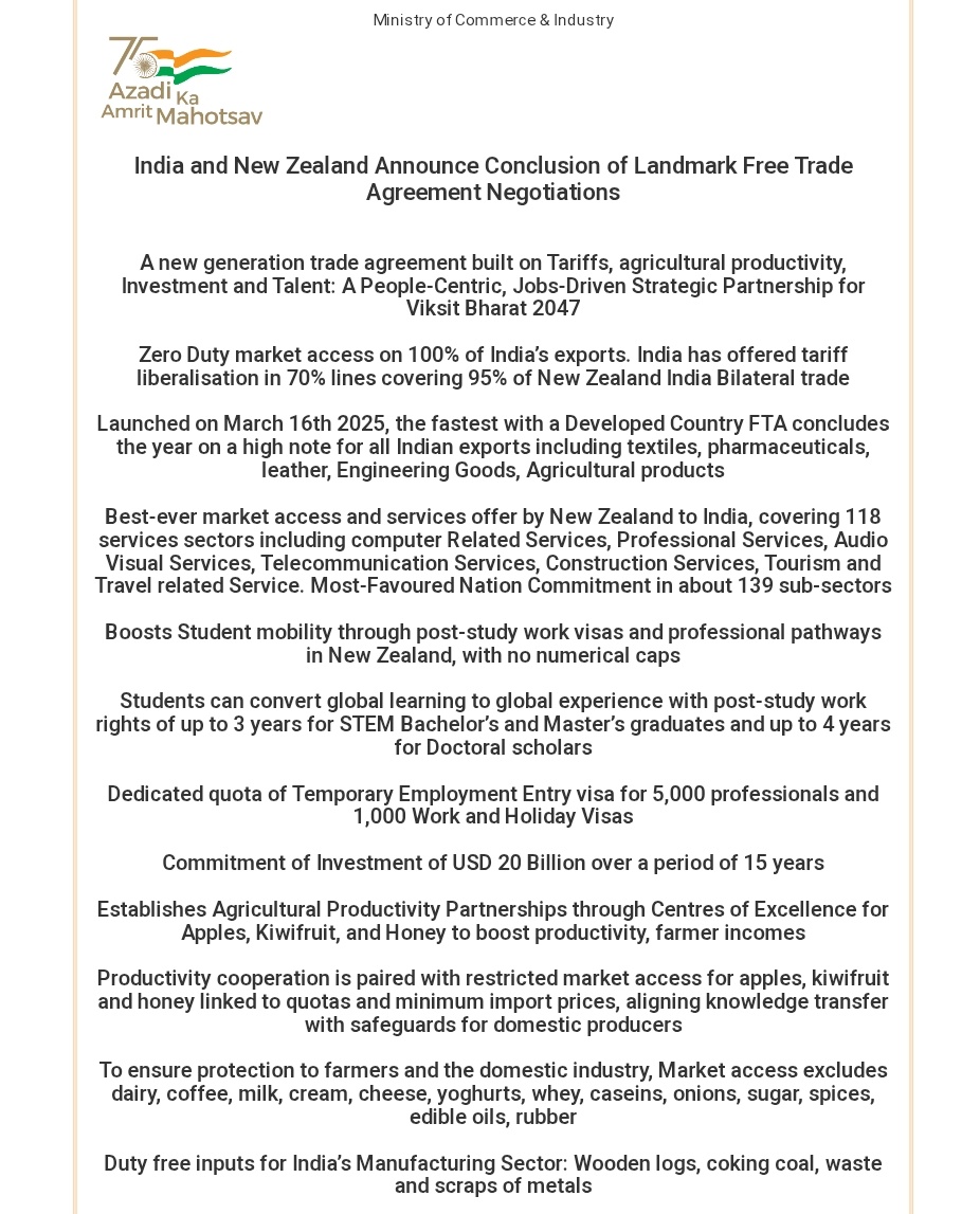 - इस दौरान दोनों नेताओं ने भारत-न्यूजीलैंड के बीच मुक्त व्यापार समझौते (FTA) की घोषणा की।