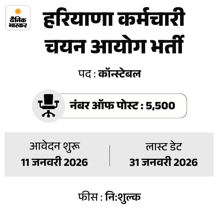 हरियाणा कर्मचारी चयन आयोग ने पुलिस कॉन्स्टेबल के 5,500 पदों पर भर्ती निकाली है। इस भर्ती के लिए आवेदन की आखिरी तारीख 31 जनवरी है। उम्मीदवार ऑफिशियल वेबसाइट hssc.gov.in पर जाकर ऑनलाइन आवेदन कर सकते हैं।