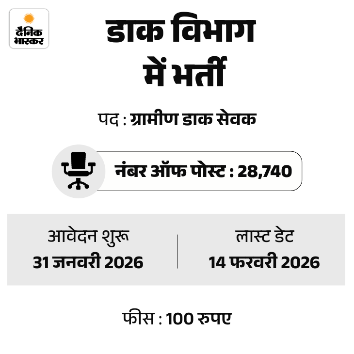 भारतीय डाक विभाग में 28,740 पदों पर भर्ती का नोटिफिकेशन जारी किया है। उम्मीदवार ऑफिशियल वेबसाइट indiapostgdsonline.gov.in पर जाकर आवेदन कर सकते हैं। 18 और 19 फरवरी, 2026 को करेक्शन विंडो ओपन की जाएगी।