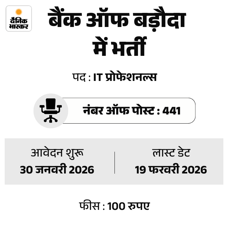 बैंक ऑफ बड़ौदा यानी BOB ने आईटी प्रोफेशनल्स की भर्ती का नोटिफिकेशन जारी किया है। इस भर्ती अभियान के तहत 418 पद रेगुलर और 23 पद कॉन्ट्रैक्ट बेसिस पर भरे जाएंगे। फीस जमा करने की आखिरी तारीख 19 फरवरी, 2026 तय की गई है।
