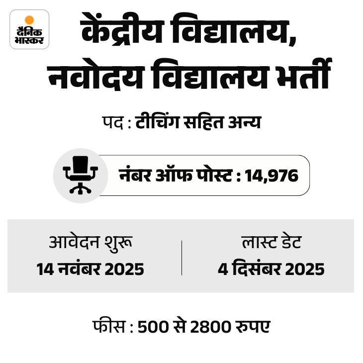 CBSE ने केंद्रीय विद्यालय और नवोदय विद्यालय में प्राइमरी टीचर की 14,967 भर्तियों का डिटेल्ड नोटिफिकेशन जारी किया है। कैंडिडेट्स kvsangathan.nic.in या navodaya.gov.in पर जाकर अप्लाई कर सकते हैं।