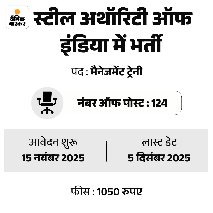 स्टील अथॉरिटी ऑफ इंडिया लिमिटेड (सेल) ने मैनेजमेंट ट्रेनी (टेक्निकल) के पदों पर भर्ती निकाली है। अधिकतम 28 साल तक के इंजीनियरिंग डिग्री धारक 16 नवंबर तक इसमें आवेदन कर सकते हैं।