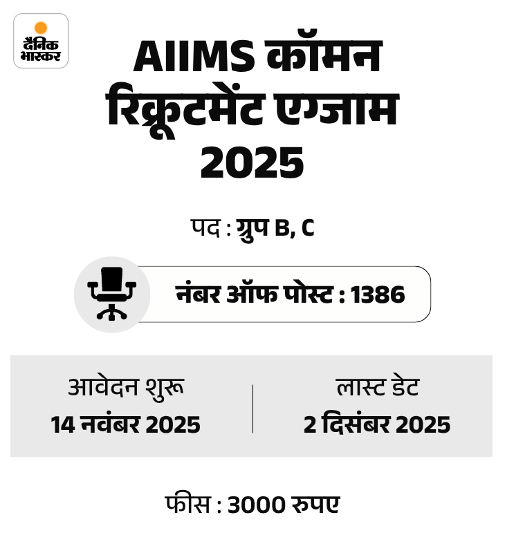 AIIMS कॉमन रिक्रूटमेंट एग्जामिनेशन में ग्रुप B, C के 1386 पदों पर आवेदन शुरू हो गए हैं। 40 साल तक के 10वीं पास कैंडिडेट्स 2 दिसंबर तक इसमें आवेदन कर सकते हैं।