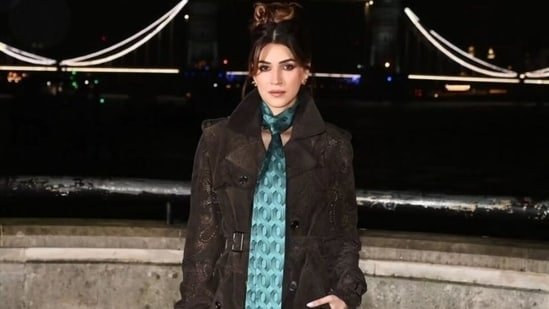 Kriti opted for a longline version of the house’s signature trench coat, which she paired with a teal scarf. The Burberry trench dress, in a stylish mocha brown shade, is made of cut-up leather and features notch lapel collars, which the actor raised to add a sharp look to her attire.