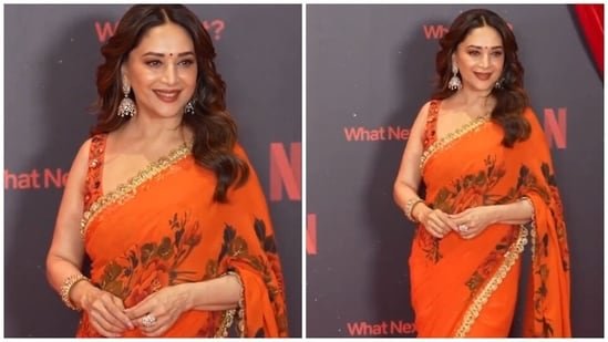 Among the titles unveiled at Netflix’s 2026 slate presentation, Madhuri Dixit and Triptii Dimri-starrer film Maa Behen was also announced. For the occasion, Madhuri wore a gorgeous orange, floral-printed saree. Let’s decode the traditional look: