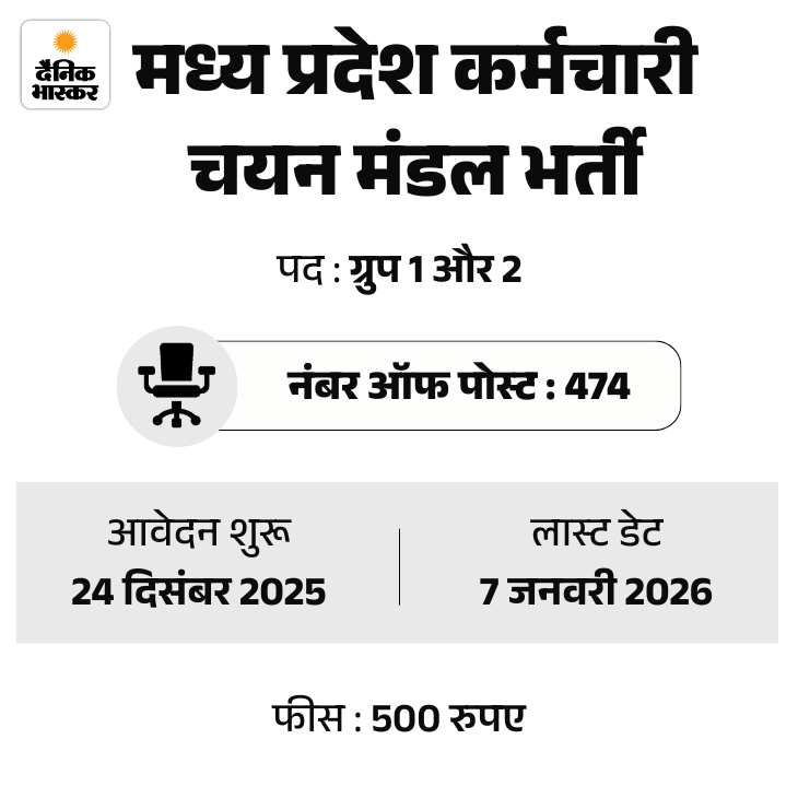 मध्य प्रदेश कर्मचारी चयन मंडल (MPESB) की ओर से ग्रुप-1 और 2 के पदों पर भर्ती का नोटिफिकेशन जारी किया गया है। इन पदों पर आवेदन प्रक्रिया 24 दिसंबर, 2025 से शुरू हो जाएगी। उम्मीदवार ऑफिशियल वेबसाइट esb.mp.gov.in पर जाकर आवेदन कर सकेंगे।
