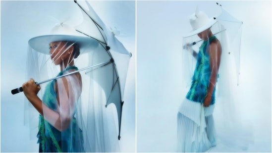 Osaka walked onto the court in an ocean-blue tie-dye tracksuit jacket paired with white wide-leg trousers, both adorned with soft ruffles. Her on-court outfit also included a pleated miniskirt layered over the trousers, a wide-brimmed hat with a delicate white veil, and a parasol, all contributing to the whimsical, jellyfish-inspired look.