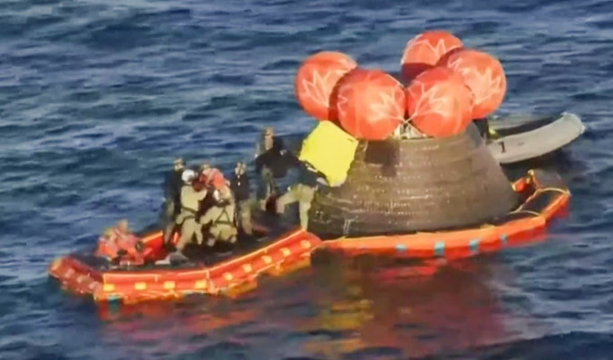 Orion कैप्सूल 10 अप्रैल को प्रशांत महासागर में उतरा, जिससे अंतरिक्ष में उसका लगभग 10 दिन का मिशन खत्म हो गया। उसके बाद, इसे San Diego से Cape Canaveral तक ट्रक से बहुत सावधानी से पहुँचाया गया।