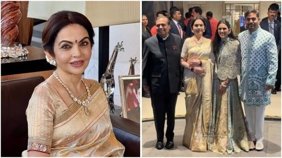 Going with her signature style of donning heavily embellished ensembles paired with statement high-end jewellery, Nita Ambani opted for a refined six-yard drape for the occasion. The elegant saree featured subtle metallic gold detailing and was paired with a striking statement necklace, allowing the look to remain subtle yet undeniably graceful, effortlessly balancing minimalism with timeless charm.
