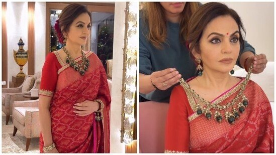 A new video of Nita Ambani getting ready for an event in a red silk saree just dropped online, showcasing some incredible sartorial and gemmaphile prowess. The Reliance Foundation chairperson never holds back when it comes to jewels. For this look, she chose a gold-and-emerald necklace from her personal collection and adorned her neck with it.