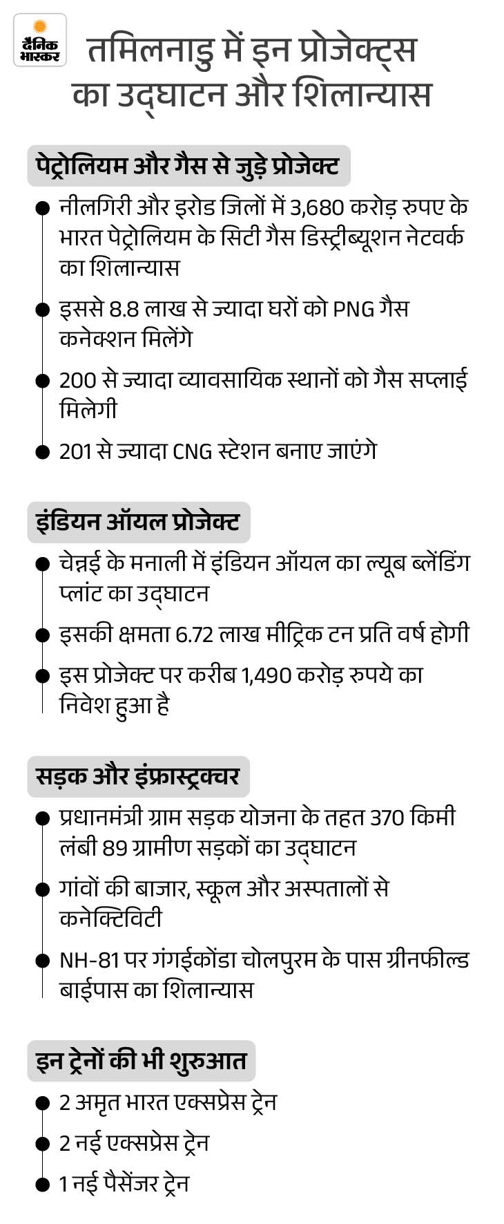 - पीएम ने केरल के एर्नाकुलम में करीब 10,800 करोड़ और तमिलनाडु के तिरुचिरापल्ली में करीब 5,650 करोड़ रुपए के प्रोजेक्ट्स का उद्घाटन और शिलान्यास किया।