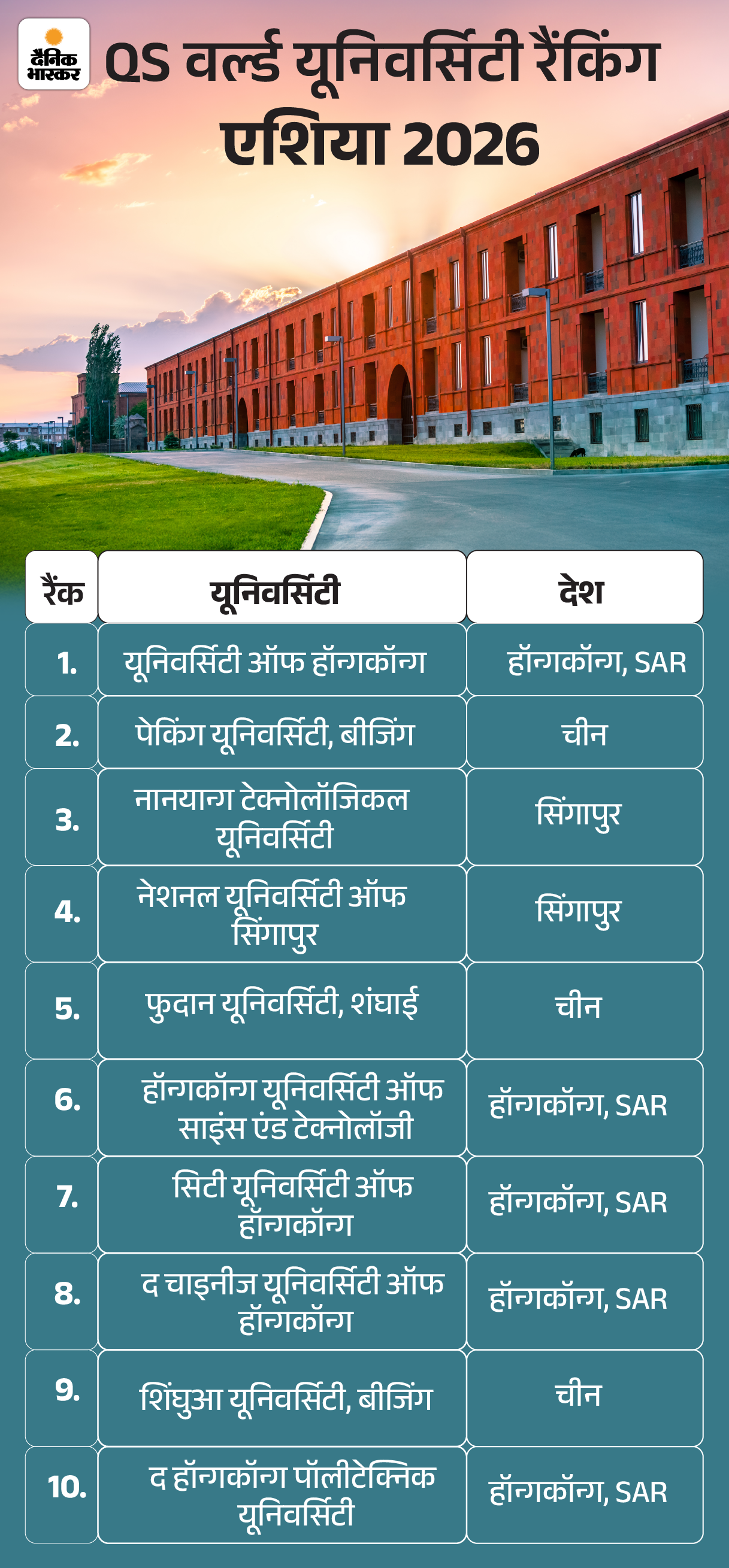 QS वर्ल्ड यूनिवर्सिटी रैंकिंग- एशिया 2026 जारी हो चुकी है। पेकिंग यूनिवर्सिटी को पछाड़कर इस साल यूनिवर्सिटी ऑफ हॉन्गकॉन्ग पहले नंबर पर है। इस साल 1,500 से ज्यादा इंस्टीट्यूट्स को इवैल्युएट किया गया है, जिसमें 550+ नई एंट्रीज हैं।