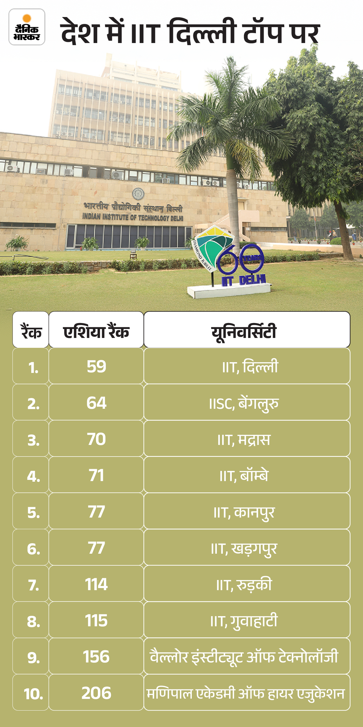 देश की एक भी यूनिवर्सिटी एशिया में टॉप 50 में नहीं है। IIT दिल्ली को इस रैंकिंग में 59वां स्थान मिला है। इसके बाद IISc, बेंगलुरु को 64वी रैंक मिली है।