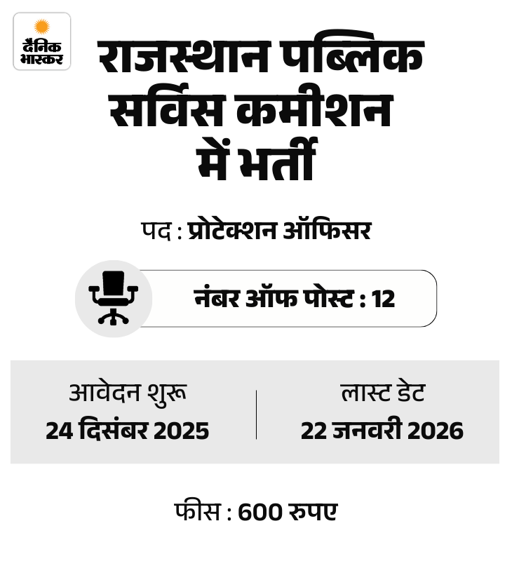 राजस्थान के महिला एंव बाल विकास विभाग में प्रोटेक्शन ऑफिसर की भर्ती का नोटिफिकेशन जारी किया है। इस भर्ती के लिए कल यानी 24 दिसंबर 2025 से आवेदन शुरू हो रहे हैं। उम्मीदवार ऑफिशियल वेबसाइट rpsc.rajasthan.gov.in पर जाकर अप्लाई कर सकेंगे।