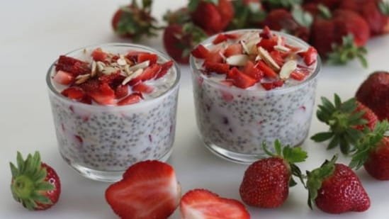 - Add chopped strawberries, chia seeds, almonds, and vanilla powder.