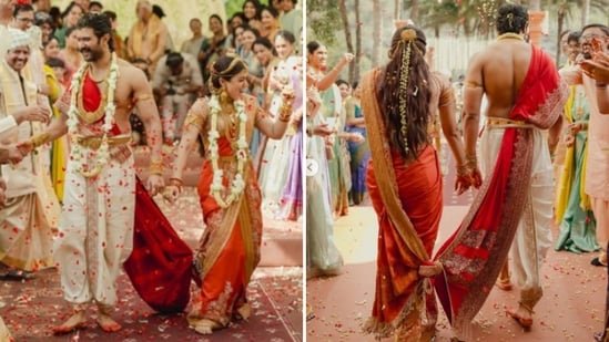 On his special day, the 36-year-old actor wore an ivory silk dhoti, which he paired with a striking vermillion angavastram (shawl). They were intricately embroidered along the hem with temple-inspired motifs.