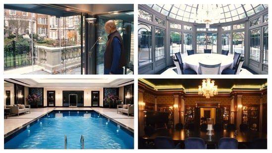 Despite its prime London location, the house prominently features Indian elements, including a dedicated space for daily prayer. Due to the home’s multi-story layout, it also features a custom-designed glass elevator that provides easy access between the entertaining levels and the private quarters. However, two of the most talked-about features are the high-tech banquet hall and the light-filled conservatory.