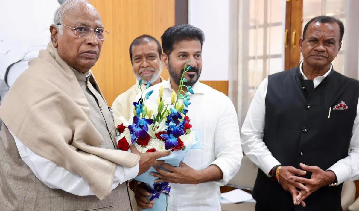 कांग्रेस के शीर्ष नेतृत्व ने तेलंगाना के मुख्यमंत्री रेवंत रेड्डी और उनके मंत्रिमंडल के मंत्रियों के साथ राष्ट्रीय राजधानी में पार्टी अध्यक्ष मल्लिकार्जुन खरगे के आवास पर एक महत्वपूर्ण बैठक की। इस बैठक में लोकसभा में विपक्ष के नेता राहुल गांधी और अन्य कांग्रेस नेता उपस्थित थे। तेलंगाना कांग्रेस ने X पर पोस्ट किया कि दिल्ली में एआईसीसी अध्यक्ष मल्लिकार्जुन खरगे के आवास पर एआईसीसी अध्यक्ष खर्गे, लोकसभा में विपक्ष के नेता राहुल गांधी और एआईसीसी महासचिव केसी वेणुगोपाल ने तेलंगाना के प्रमुख नेताओं के साथ एक महत्वपूर्ण बैठक की।