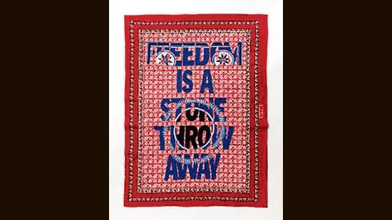 These are words South African visual artist Lawrence Lemaoana, 44, embroidered onto Kanga cotton in 2017. Lemaoana’s use of kanga as a medium for aphorisms draws from Swahili culture, which has a rich tradition of proverbs as storehouses of wit and wisdom, and of women embroidering on fabric as a way to exchange such ideas.