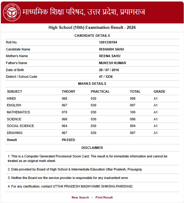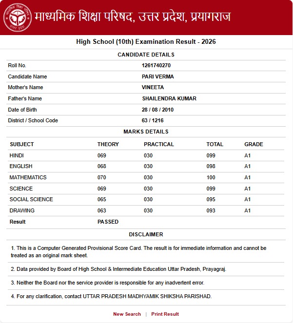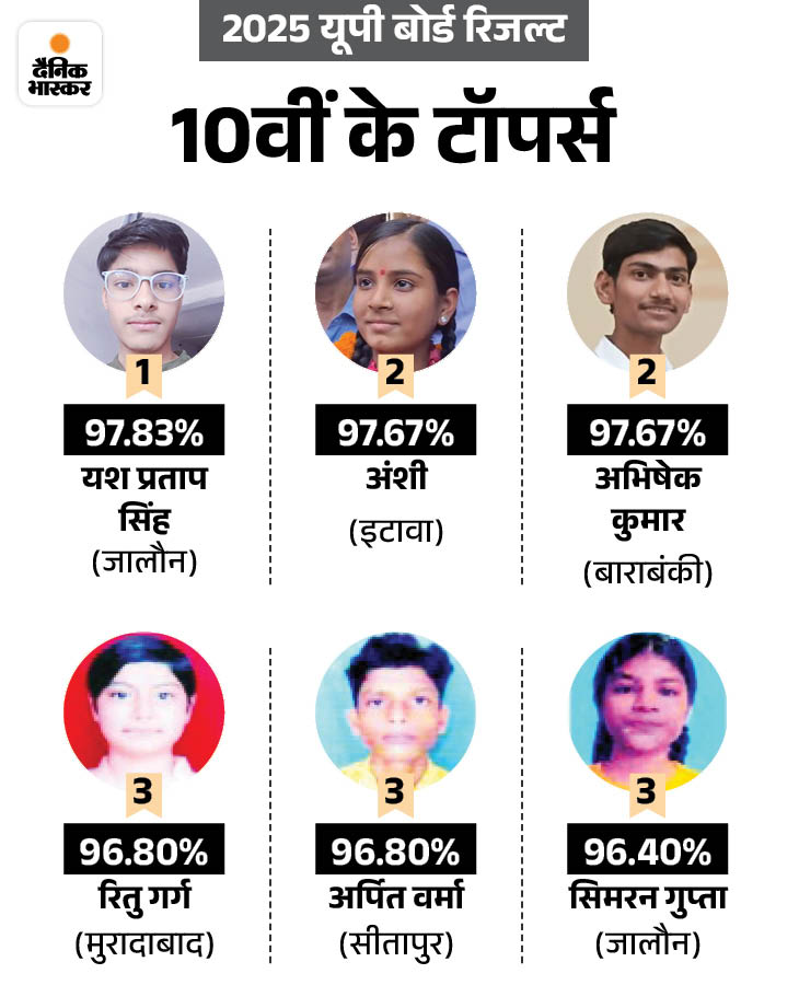 - 2025 के रिजल्ट में 10वीं में जालौन के यश ने टॉप किया था। उन्हें 97.83% अंक मिले थे। 97.67% अंकों के साथ इटावा की अंशी और बाराबंकी के अभिषेक दूसरे स्थान पर रहे। तीसरे स्थान पर मुरादाबाद की रितू गर्ग, सीतापुर के अर्पित वर्मा और जालौन की सिमरन गुप्ता रहीं।