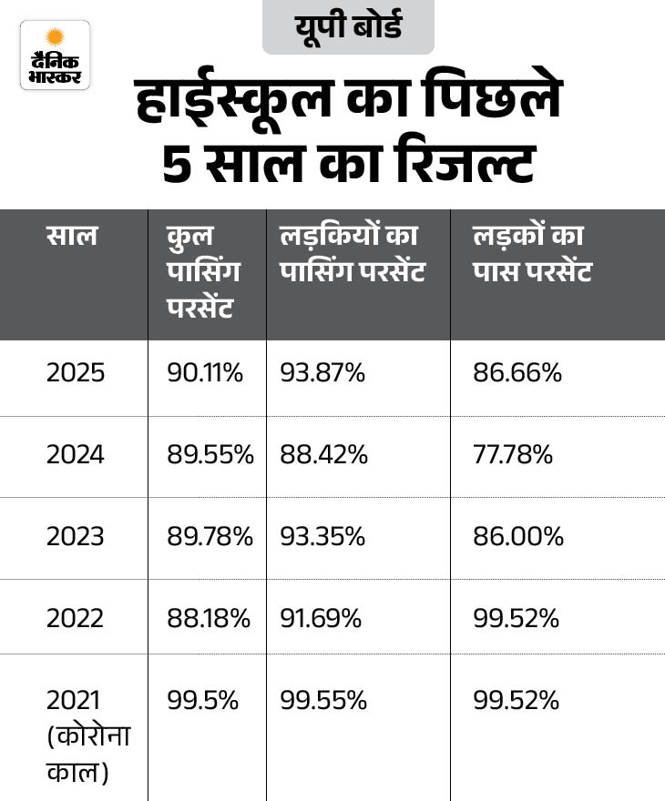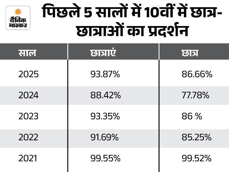 - 2025 में 93.87% लड़कियां पास हुई थीं, जबकि लड़के 86.66% ही पास हुए थे। इसी तरह 2024 में छात्राओं का पासिंग प्रतिशत 88.42 रहा, छात्रों का 77.78% ही रहा था।