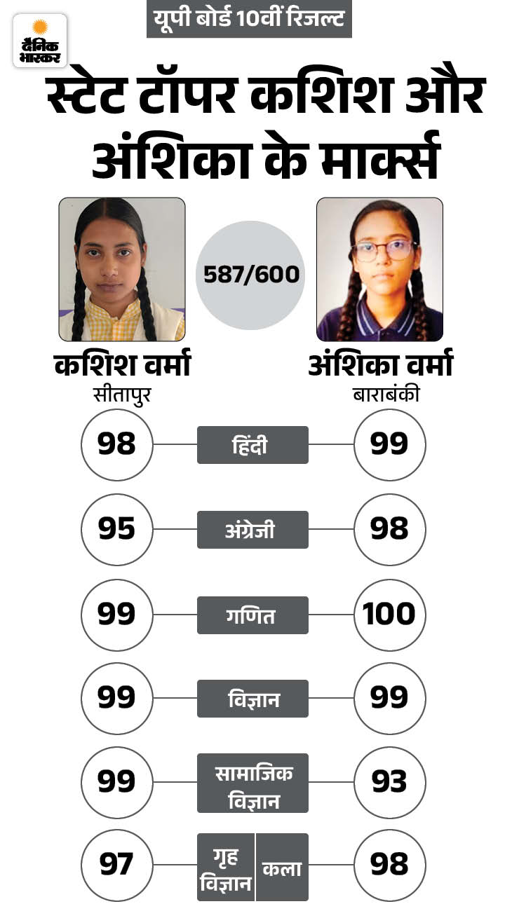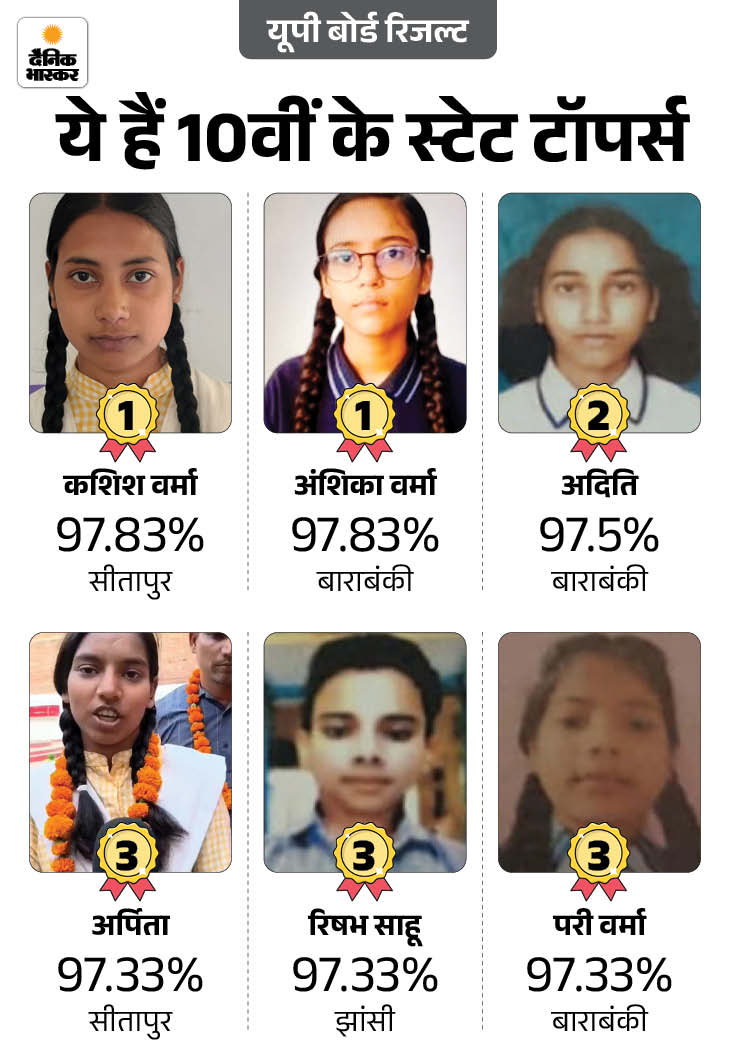 यूपी बोर्ड 10वीं का रिजल्ट गुरुवार शाम 4 बजे जारी हुआ। सीतापुर की कशिश वर्मा और बाराबंकी की अंशिका वर्मा ने टॉप किया है। दोनों को 97.83% अंक मिले। 97.50% अंकों के साथ बाराबंकी की अदिति दूसरे स्थान पर रहीं। तीसरे स्थान पर 97.33% अंकों के साथ सीतापुर की अर्पिता, झांसी के ऋषभ साहू और बाराबंकी की परी वर्मा रहीं।