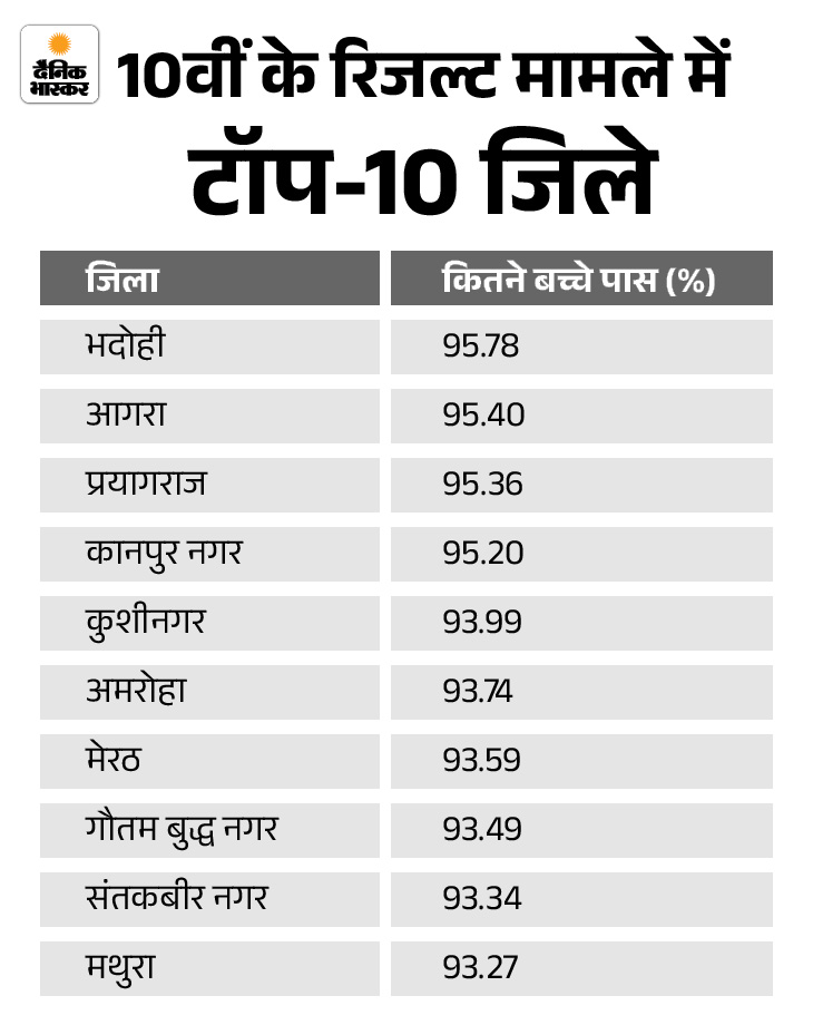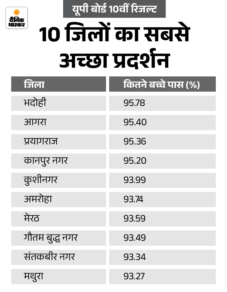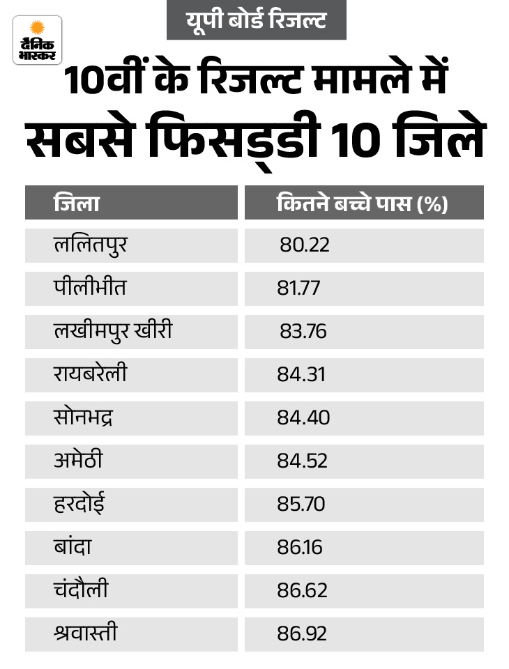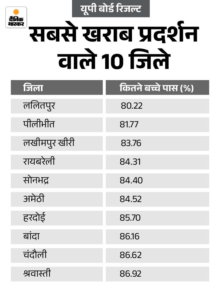 भदोही जिले का रिजल्ट सबसे अच्छा रहा। यहां 95.78% बच्चे पास हुए। ललितपुर सबसे फिसड्डी रहा। यहां सिर्फ 80.22% बच्चे पास हुए। सरकारी स्कूलों के 87.93% बच्चे पास हुए। वहीं, एडेड (अर्द्धसरकारी) स्कूलों के 86.98% और सेल्फ फाइनेंस (प्राइवेट) स्कूलों के 92.32% बच्चे सफल हुए।