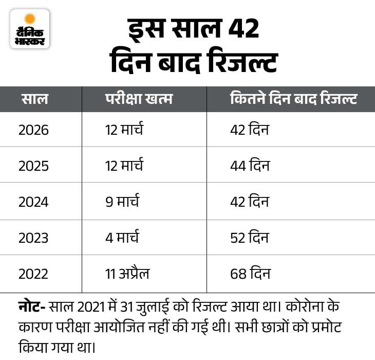 - 2023 में रिजल्ट 25 अप्रैल को आया था। परीक्षा 16 फरवरी 2023 से शुरू हुई थी। 10वीं की परीक्षा 3 मार्च और 12वीं की परीक्षा 4 मार्च 2023 तक चली थी। 52 दिन बाद रिजल्ट जारी किया गया था।