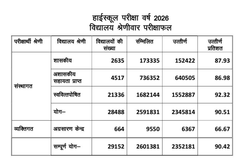 हाईस्कूल में सरकारी स्कूलों 87.93% बच्चे पास हुए हैं। वहीं, एडेड (अर्द्धसरकारी) स्कूलों में 86.98% बच्चे पास हुए हैं। ऐसे सेल्फ फाइनेंस (प्राइवेट) स्कूलों के 92.32% बच्चे पास हुए हैं।