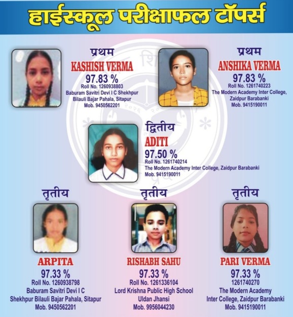 हाईस्कूल में टॉप 10 में लखनऊ के 2 स्टूडेंट्स अदरिजा चौरसिया और आरोही सिंह शामिल हैं। दोनों को 96.17% मिले हैंष LPS राजाजीपुरम ब्रांच के 2 स्टूडेंट्स को स्टेट में 10वीं रैंक मिली है।